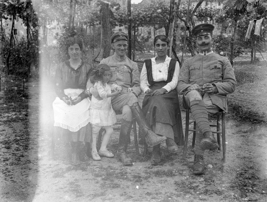 Ritratto di due soldati e due donne seduti su sedie in un giardino; le donne, che affiancano gli uomini tengono in mano una rosa; una bimba, con grazioso abito e scarpette bianche, in piedi, è appoggiata alle gambe di uno dei due militari, probabilmente il padre, anche lei con una rosa in mano.