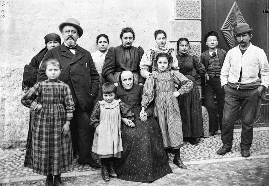 Ritratto di famiglia: non vi sono scenografie da studio fotografico ma semplicemente la parete, il portone in legno di un'abitazione e la strada a ciottoli che contestualizza la provenienza non borghese della famiglia ma che, con grande dignità, sfoggia l'abito e il sorriso migliore per l'occasione, probabilmente unica, del ritratto dell'intera famiglia.