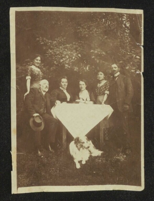 Ritratto di un gruppo di donne e uomini in pedi e seduti ad un tavolo con tovaglia posizionato su di un giardino.