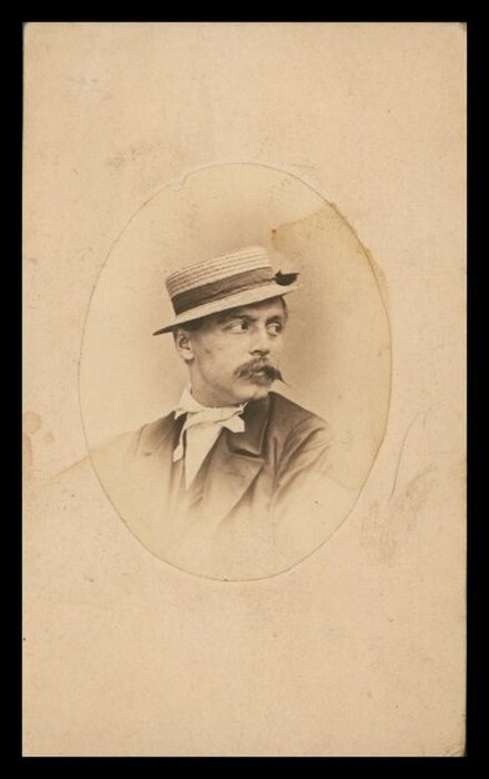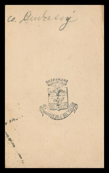 Ritratto in studio a mezzo busto di un uomo con cappello: secondo l'iscrizione riportata sul verso del supporto secondario, trattasi del co.(conte) Gyula Andrássy (1860-1929) ultimo ministro degli esteri dell'impero austro-ungarico.