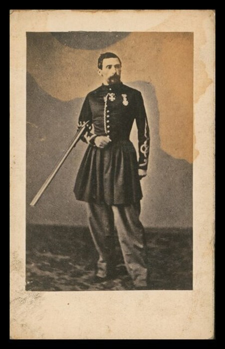 Ritratto a figura intera di uomo in divisa, con fucile a doppietta appoggiato sotto il braccio. Sul verso dell'immagine, una annotazione a mano che riporta il nome di tale Girard, consente di identificare il soggetto in Cirille Jules Basile Gérard (1817-1864), noto come "l'uccisore di leoni", soldato, esploratore e cacciatore francese. Morì mentre cercava le sorgenti del Niger in Sierra Leone, annegando nel fiume Jong, forse ucciso dai membri della sua stessa spedizione.