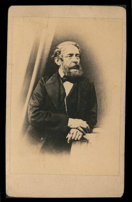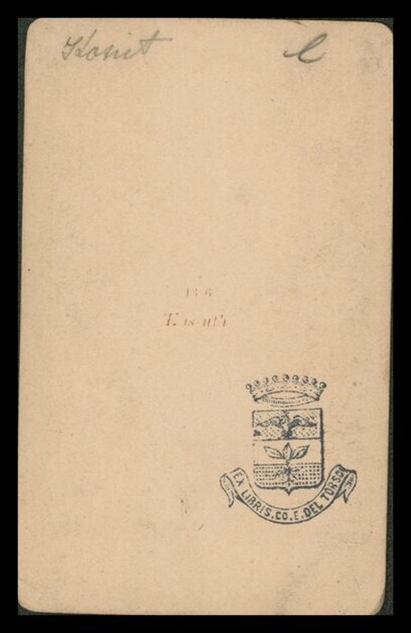 Ritratto in studio a mezzo busto, appoggiato ad una balaustra, di Lajos Kossuth (1802–1894), nobile, avvocato, giornalista e politico ungherese. Fu a capo dell'ala democratico-radicale dei nazionalisti ungheresi che attuò l'indipendenza dell'Ungheria dall'Impero austriaco durante i moti del 1848 e che durò fino all'agosto del 1849, quando la giovane repubblica ungherese, di cui Kossuth fu governatore-presidente, fu invasa da 250.000 russi. Considerato un eroe nazionale ungherese, dopo la seconda guerra mondiale una sua statua è stata posta nel colonnato della Piazza degli Eroi a Budapest, al posto di quella dell'imperatore Francesco Giuseppe I d'Austria. La scritta tipografica sul verso della foto non è marchio fotografico, come d'uso, bensì didascalia che identifica il soggetto ritratto.