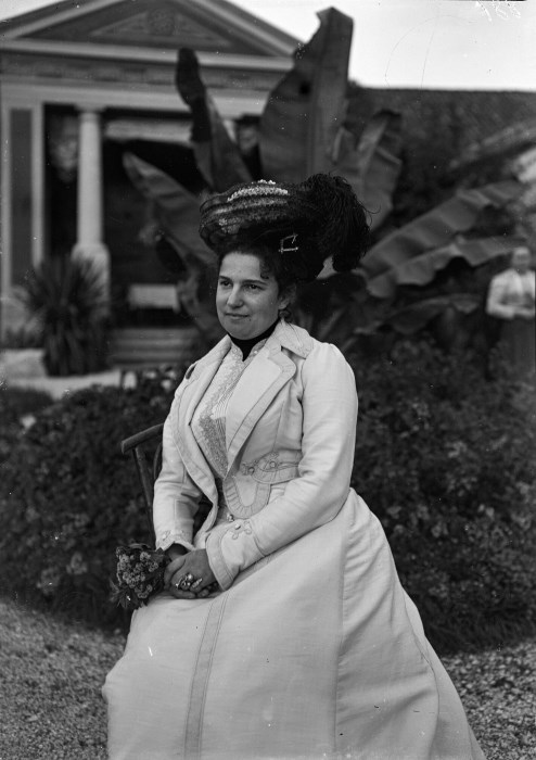 Ritratto di una nobildonna seduta con in mano un mazzetto di fiori ed un cappello con fiocco e piume, nel giardino di una villa con arbusti tropicali; sullo sfondo un edificio che ricalca il pronao di un tempio greco.