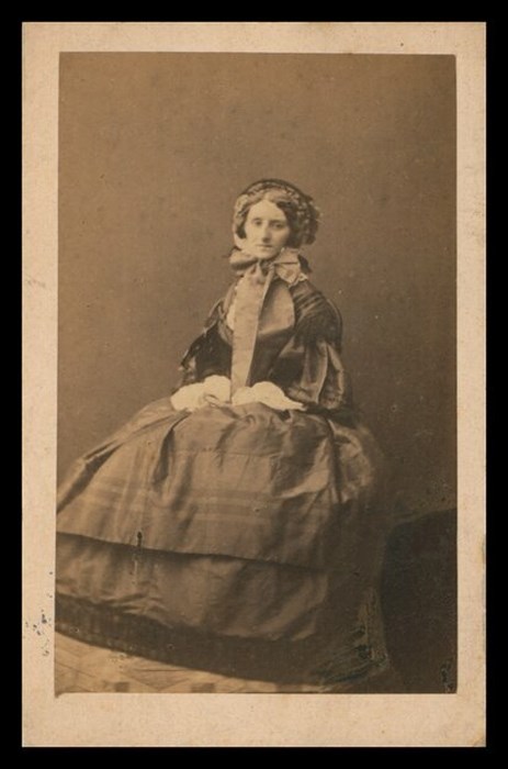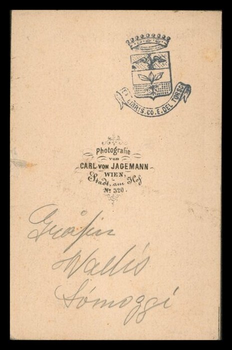 Ritratto in studio a figura intera di una nobildonna con abito ottocentesco e copricapo, seduta su di una poltroncina. Una nota sul verso dell'immagine, la identifica come contessa Wallis Somoggi, ovverosia Helene (nata il 20 luglio 1830) figlia del nobile ungherese conte Jospeh Somogyi di Medgyes, sposata (dal 24 febbraio 1852) con Julius conte Wallis.