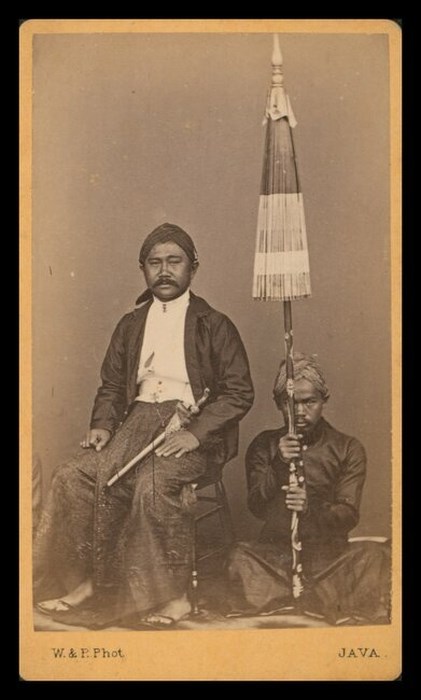 Ritratto di notabile giavanese (Java) seduto, assieme al suo servitore e ad uno stendardo