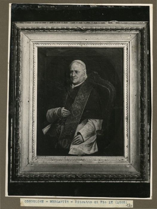 Riproduzione fotografica di un quadro in cornice lignea raffigurante un "Ritratto di Pio IX" ad opera del Morgantin e conservato presso la Chiesa di San Marco Evangelista a Corbolone di Santo Stino di Livenza.