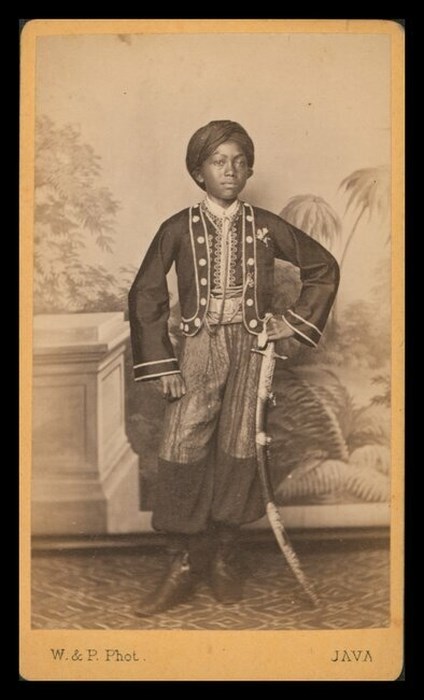 Ritratto di ragazzo giavanese (Java) in divisa, con sciabola e copricapo