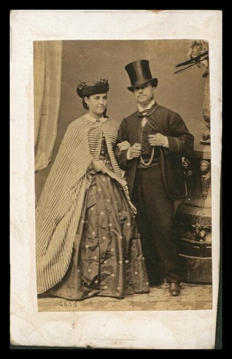 Ritratto in studio, a figura intera, di una coppia in posa. Da confronti è possibile dedurre che si tratti di una copia dello scatto del fotografo Duroni Alessandro (1807-1870), realizzato a Milano tra 1860 e 1861. Teresa Garibaldi, nota con il soprannome di Teresita (Montevideo, 22 febbraio 1845 – Caprera, 5 gennaio 1903), terzogenita di Giuseppe Garibaldi e Anita Garibaldi, nacque in Uruguay mentre il padre era impegnato nella guerra civile uruguaiana al comando della Legione italiana. Si sposa giovanissima (16 anni) con Stefano Canzio, ufficiale garibaldino conosciuto mentre si prendeva cura dei feriti della spedizione dei Mille; le nozze hanno luogo il 25 maggio 1861 a Caprera, e poi nella chiesa della Maddalena a Genova, cerimonia durante la quale riceve quale regalo di nozze da parte di re Vittorio Emanuele II una collana di pietre preziose. Dal matrimonio con Canzio nascono sedici figli, dodici dei quali raggiungeranno l'età adulta. Muore nel 1903 a La Maddalena.