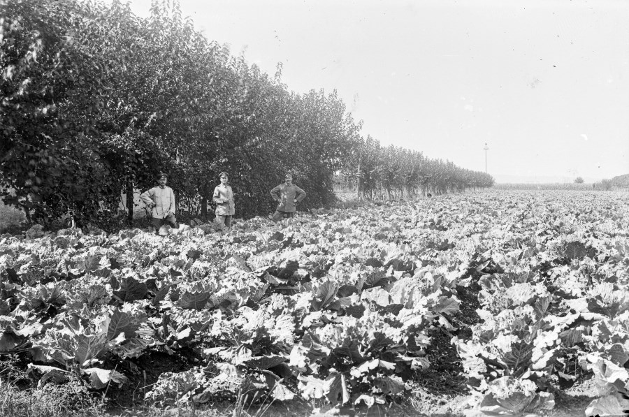 Ritratto di tre soldati presso una grande coltivazione di brassicacee