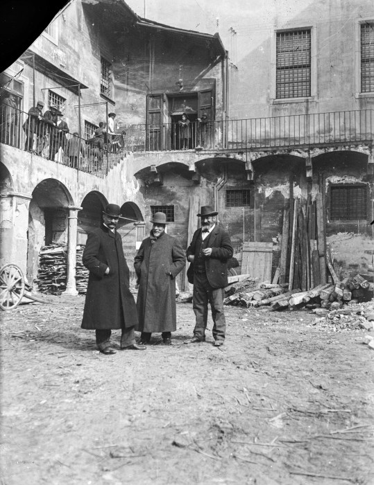 Ritratto di tre uomini con cappotto e cappello nel cortile interno del vecchio palazzo comunale di Udine, prima della sua demolizione per la costruzione di Palazzo D'Aronco, nuova sede del Municipio. L'uomo a sinistra, con elegante cappotto e bombetta scura può essere identificato con Raimondo D'Aronco, l'architetto cui venne affidato il progetto della nuova sede del Comune. La demolizione dei vecchi fabbricati ebbe inizio il 10 gennaio 1910. Nello scatto, alle loro spalle, del legname accatastato; un gruppo di uomini sta risalendo la scala esterna dell'edificio mentre alcuni di essi e due bambini osservano il fotografo dalla terrazza.