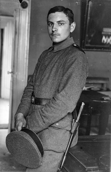 Ritratto di un soldato, visibilmente molto giovane, appoggiato ad un tavolo all'interno di una stanza.