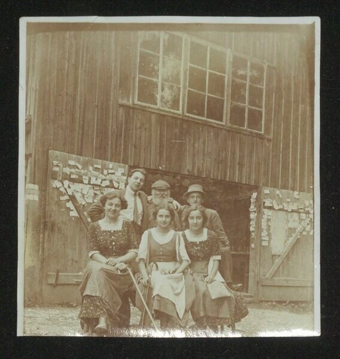 Ritratto di un gruppo all'esterno di uno stávolo di montagna: tre donne con abiti tradizionali sedute e con due bastoni da passeggio; tre uomini, un anziano al centro, in piedi dietro alle donne. Sulle porte aperte dello stávolo tanti bigliettini di carta appesi.