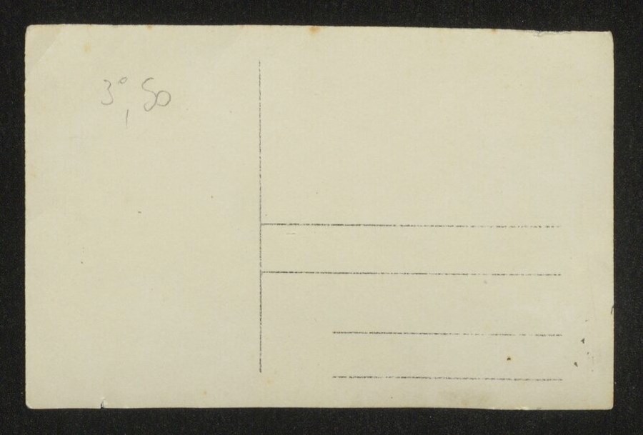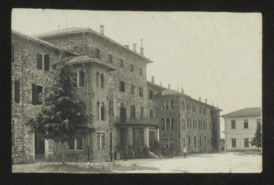 Ritratto di un gruppo di soldati in piedi e seduti fra alcune botti e sulla scalinata di un edificio urbano particolarmente grande, probabilmente una caserma militare. Nell'immagine però si dà particolare visibilità all'edificio e allo spiazzo antistante.