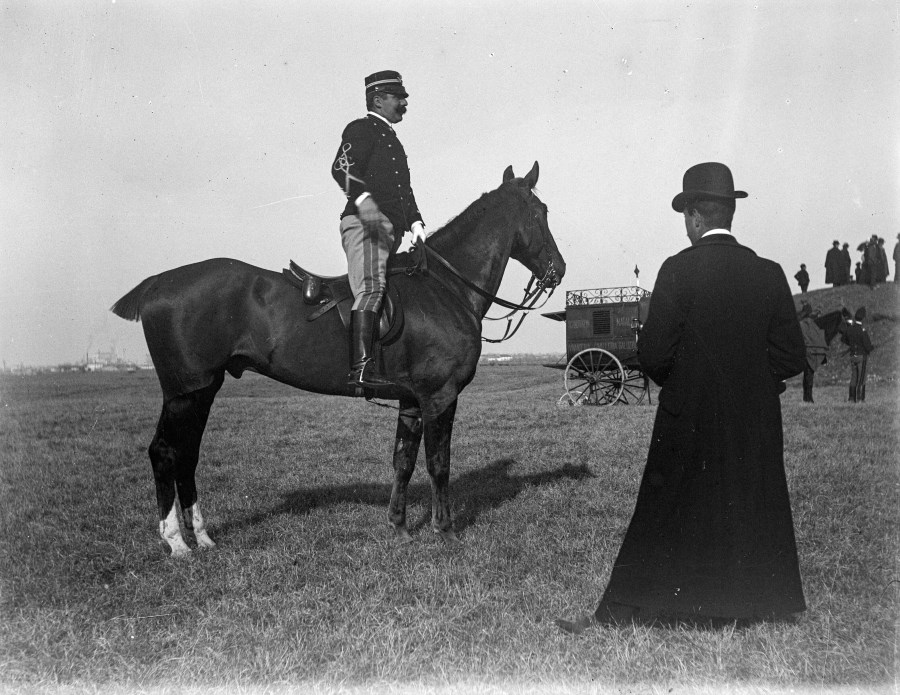 Ritratto di un militare a cavallo e, di spalle, un borghese in un grande campo. Sullo sfondo altri militari e uomini. Il carro trainato da cavalli è appartenente al Reggimento "Cavalleggeri di Saluzzo" che, nel corso della prima guerra mondiale partecipò inizialmente alle operazioni per la conquista del campo trincerato di Gorizia.
