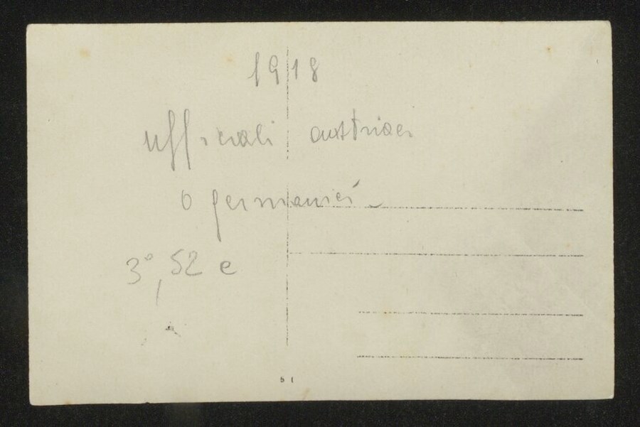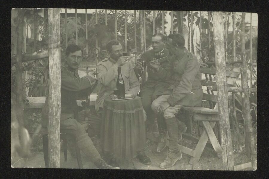 Ritratto di un momento conviviale di quattro soldati seduti sotto una veranda lignea in un giardino mentre sorseggiano del vino.