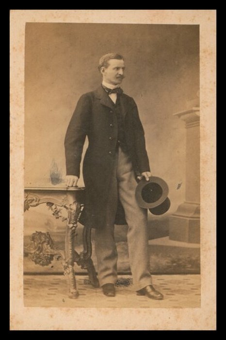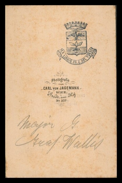 Una nota a matita sul verso dell'immagine identifica il soggetto ritratto nel Maggiore Generale Georg Grafen von Wallis (nato il 23 aprile 1856 a Kolleschowitz ; morto il 13 dicembre 1928 a Vienna ), che fu dal 1894 educatore del successivo imperatore Carlo I e dal 1911 nominato Maggiore Generale.