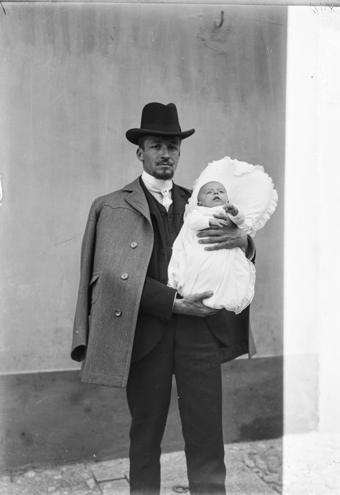 Ritratto di un giovane uomo in pedi con abito nero, una giacca appoggiata sulle spalle, ed un cappello mentre tiene in braccio un neonato, probabilmente il figlio, con abitino bianco ed un piccolo cuscino per sostenerlo.