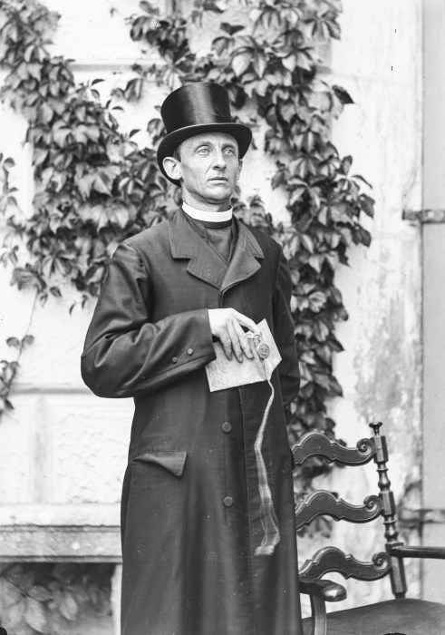 Ritratto di un parroco con in mano un breviario, indossa un cappotto e un cappello a cilindro: l'immagine lo ritrae all'esterno di un edificio, probabilmente in una terrazza accanto ad una sedia.