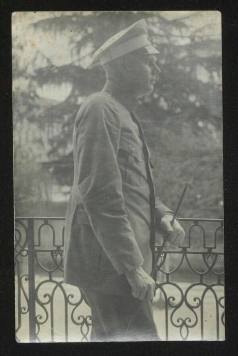 Ritratto di un soldato appoggiato ad una balaustra in ferro battuto, fra le sue mani un probabile frustino per cavalli.