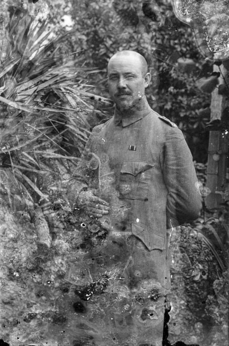Ritratto di un soldato austro-ungarico tra la vegetazione di un giardino