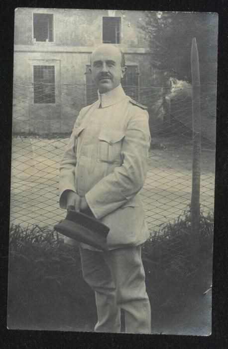 Ritratto di un ufficiale austro-ungarico nel cortile di un edificio, in piedi vicino alla recinzione.