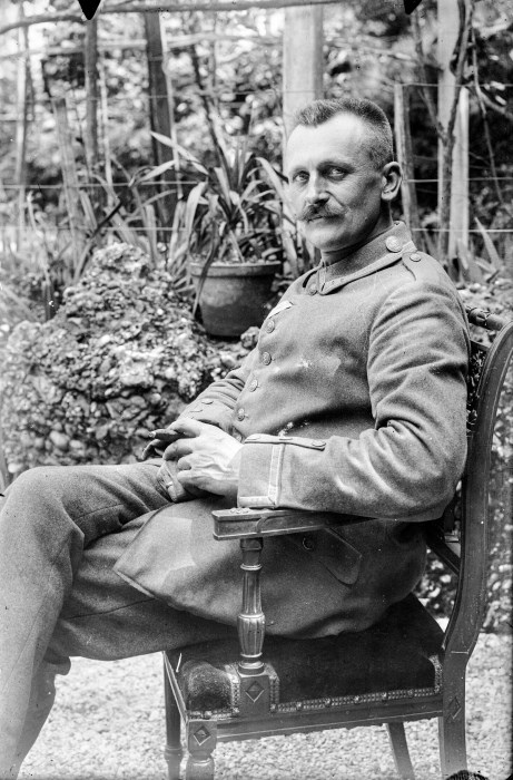 Ritratto di un ufficiale austro-ungarico seduto sulla sedia in un cortile