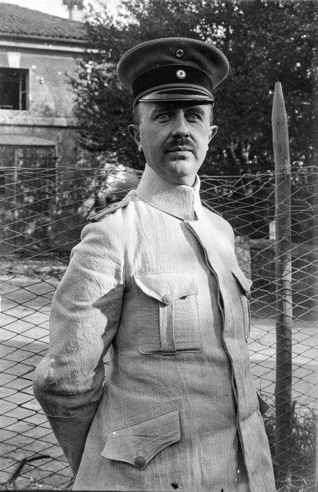 Ritratto di un ufficiale nel cortile di un edificio, in piedi vicino alla recinzione.