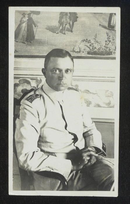 Ritratto di un ufficiale tedesco seduto all'interno di una della stanze di Casa d'Attimis già Palazzo Marcotti a Udine; alle sue spalle una parete affrescata.