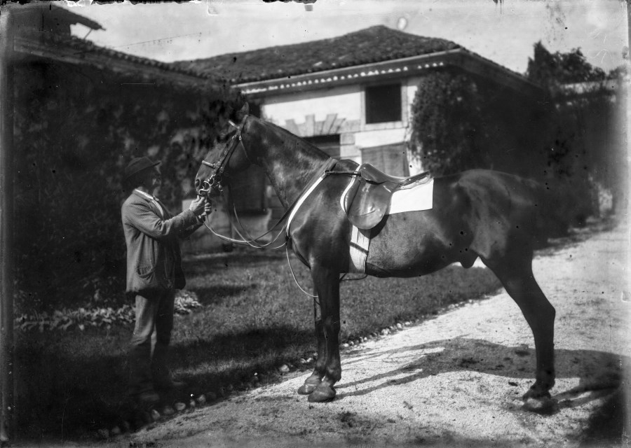 Ritratto di un uomo con cappello mentre tiene per le redini un cavallo in posa per lo scatto fotografico nei giardini di un edificio.