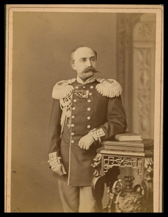Ritratto a mezzobusto allargato in studio di un uomo in uniforme, forse un ufficiale, appoggiato ad un piccolo tavolo con un libro.