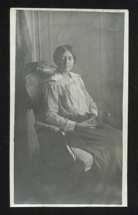 Ritratto di una donna seduta in una poltrona all'interno di una stanza; a sinistra alla parete un abito appeso. Probabilmente è la compagna di un ufficiale di stanza a Udine durante l'occupazione tedesco austro-ungarica in Friuli nel primo conflitto mondiale.