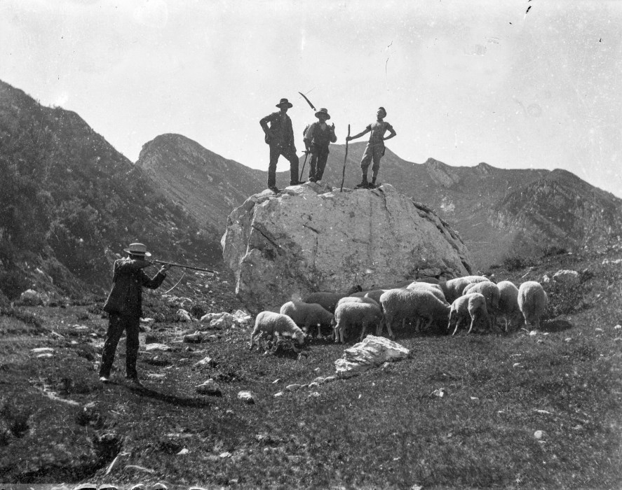 Uomini in montagna posano per la fotografia con un gregge di pecore: tre uomini sopra una roccia ai cui piedi vi è un piccolo gregge di pecore; un uomo sulla sinistra simula lo sparo con il fucile sulle pecore