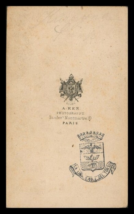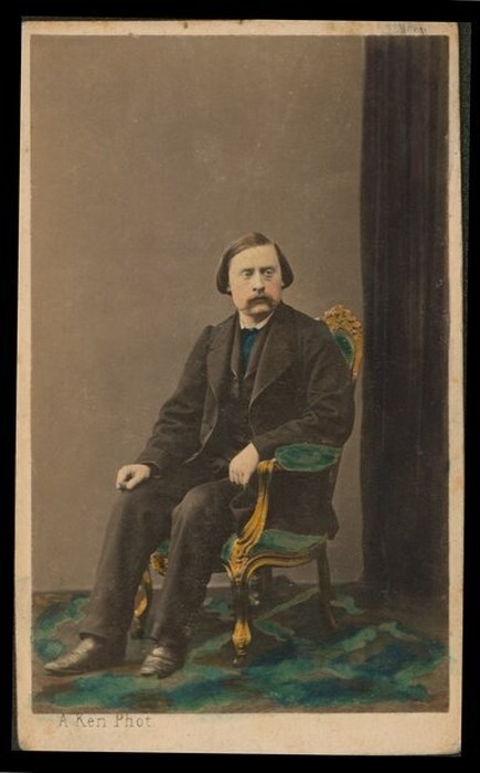 Ritratto in studio di uomo coi baffi, seduto su una poltrona. L'immagine è stata colorata.