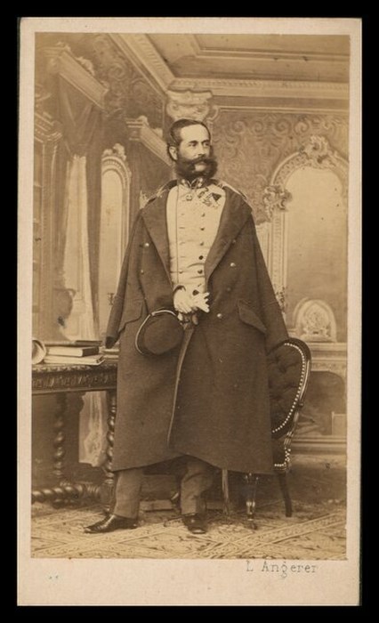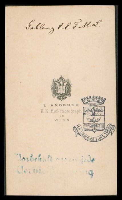 Ritratto in studio a figura intera di un uomo in divisa militare con mantello sulle spalle, guanti bianchi e cappello fra le mani; dietro a lui una poltroncina, a sinistra un tavolo con alcuni libri, il fondale raffigura l'interno di una villa. La didascalia sul verso dell'immagine permette l'identificazione del soggetto ritratto, con Ludwig Karl Wilhelm Freiherr von Gablenz (1814-1874) militare, politico e diplomatico austriaco.