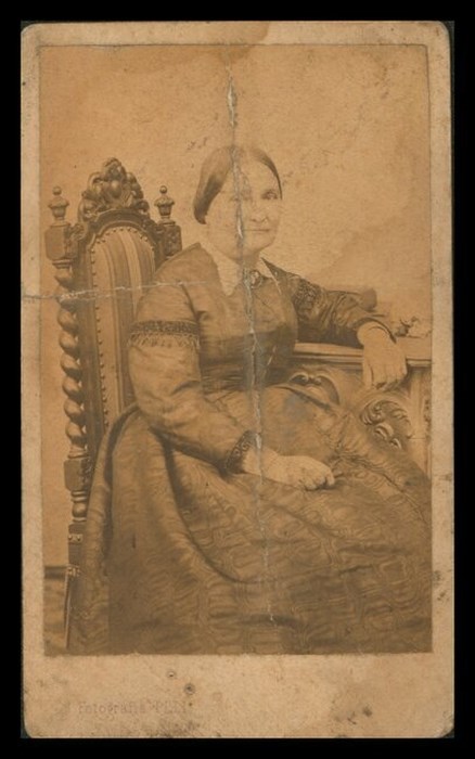 Ritratto in studio di donna, seduta su una sedia con schienale imbottito e importante struttura in legno, appoggiata ad una balaustra.