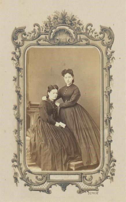 Ritratto in studio di due giovani donne con ampi abiti scuri