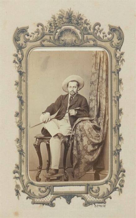 Ritratto, in studio, di un giovane uomo con cappello, seduto su di un tavolino, con sigaro in bocca e bastone in mano
