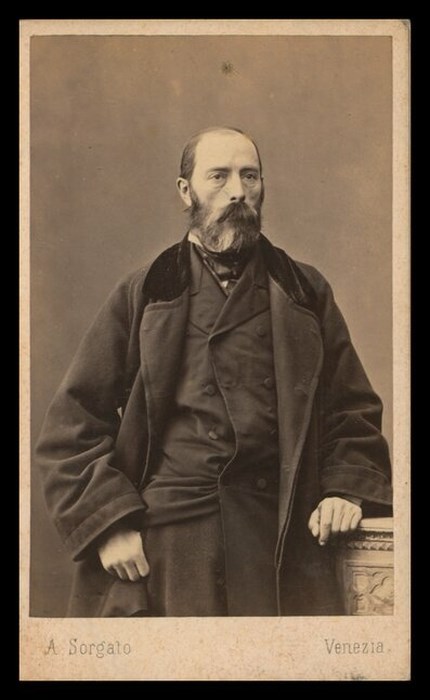 Ritratto di uomo con barba e baffi, con indosso un cappotto, appoggiato ad una balaustra