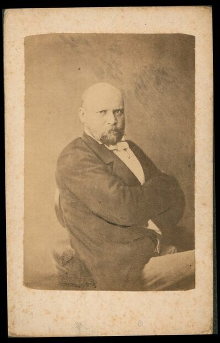 Ritratto in studio di uomo seduto con barba e baffi e con le braccia conserte