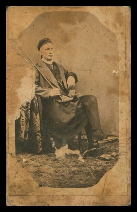 Ritratto di notabile, seduto con le gambe accavallate e con bastone da passeggio appoggiato alla spalla destra