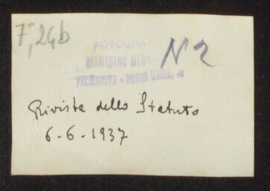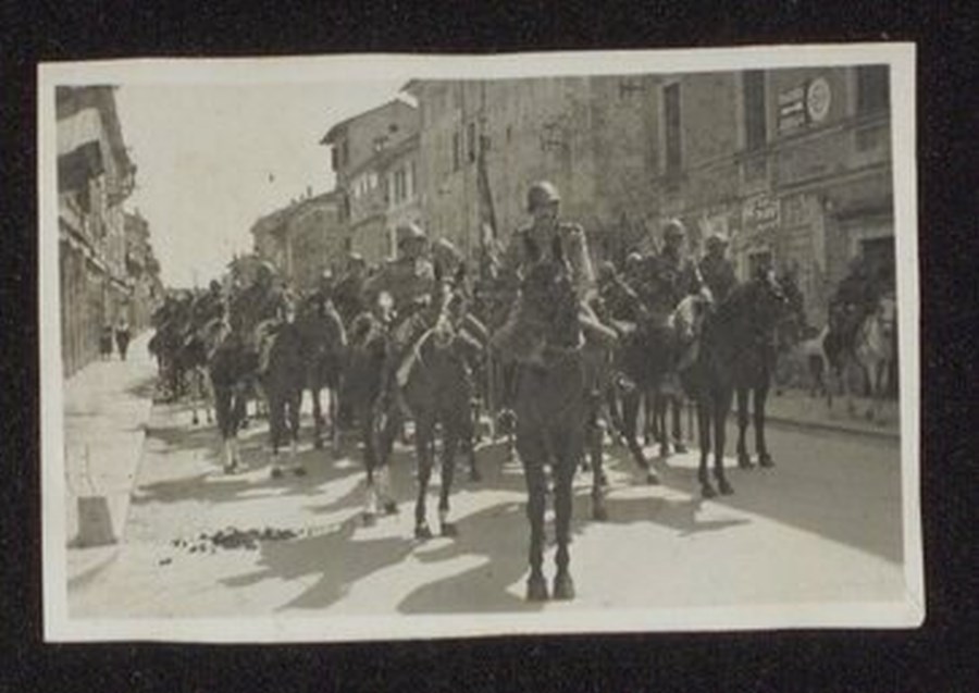 La rivista militare a Palmanova durante le celebrazioni dello Statuto, il 6 giugno 1937. Durante il Regno d'Italia, la prima domenica di giugno si celebrava la Festa dello Statuto Albertino, lo Statuto del Regno di Sardegna, diventato poi nel 1861 la prima Costituzione del Regno d'Italia, promulgato dal Re Carlo Alberto di Savoia a Torino nel 1848. L'immagine, che ritrae un gruppo di militari a cavallo mentre sfila lungo una via di Palmanvoa, è parte di un gruppo di 6 fotografie scattate durante l'evento.