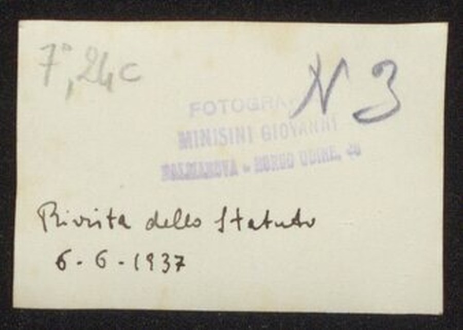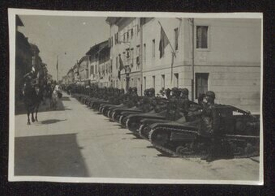 La rivista militare a Palmanova durante le celebrazioni dello Statuto, il 6 giugno 1937. Durante il Regno d'Italia, la prima domenica di giugno si celebrava la Festa dello Statuto Albertino, lo Statuto del Regno di Sardegna, diventato poi nel 1861 la prima Costituzione del Regno d'Italia, promulgato dal Re Carlo Alberto di Savoia a Torino nel 1848. L'immagine, che ritrae una serie di mezzi cingolati schierati lungo una via di Palmanova, è parte di un gruppo di 6 fotografie scattate durante l'evento.