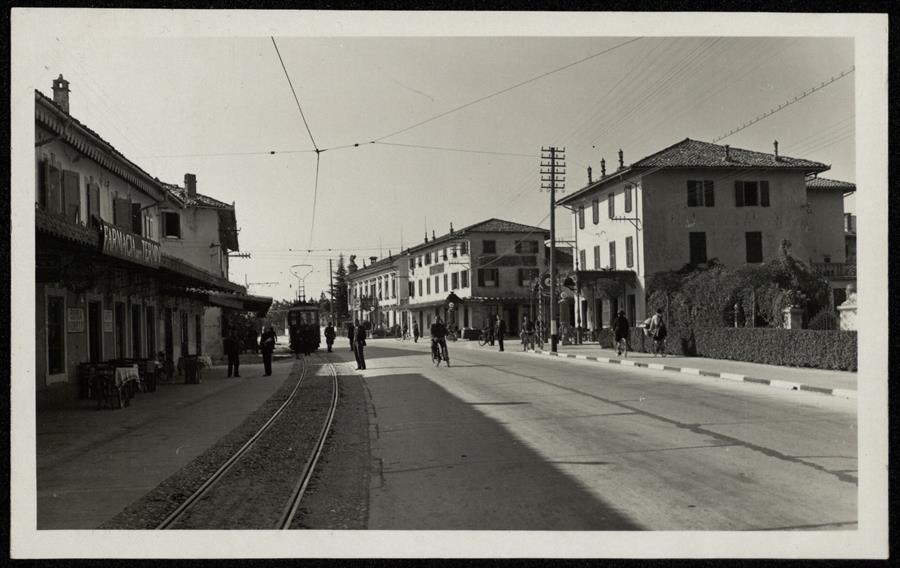 L'abitato di Santa Caterina. A sinistra, il tram che collegava la località con piazza Libertà a Udine