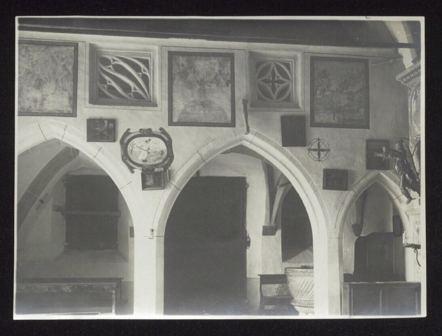 Veduta del parapetto della tribuna intero con gli affreschi raffiguranti Storie della vita di San Leonardo di ambito friulano all'interno della chiesa di San Floriano ad Illegio, frazione di Tolmezzo.