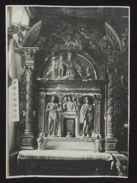 Altare in legno e pietra con la Madonna e Bambino e Santi di Carlo di Francesco da Carona nella canonica della chiesa di San Floriano ad Illegio, frazione di Tolmezzo.