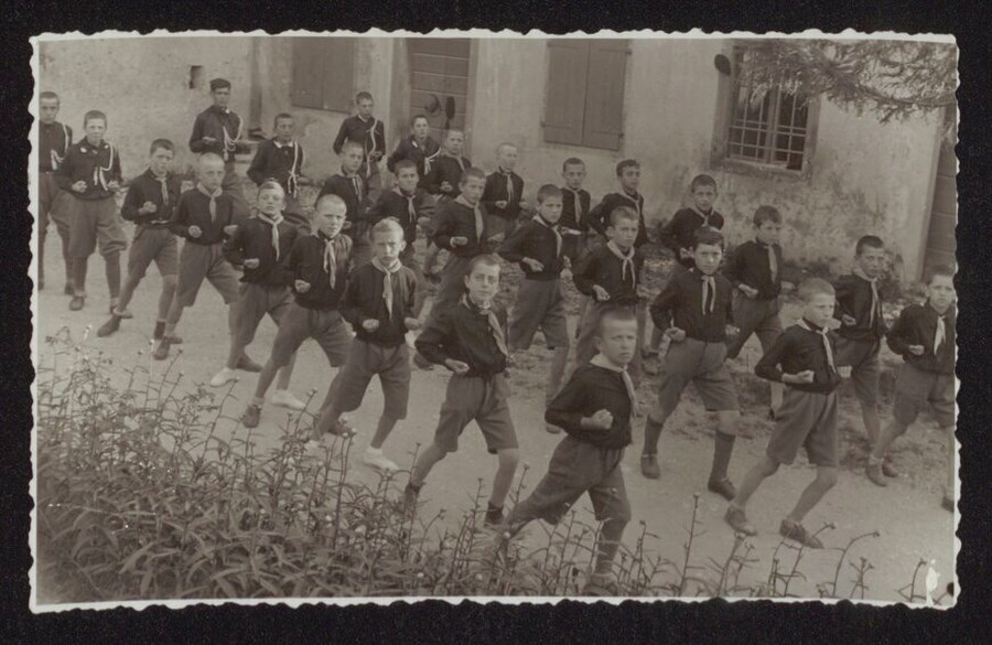 Gruppo di bambini in divisa da Balilla mentre svolgono attività ginniche all'aperto. La didascalia sul verso della fotografia colloca lo scatto a Sedegliano e e lo data al 22 giugno 1934.