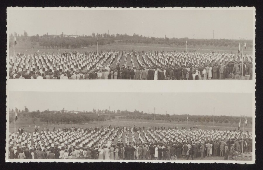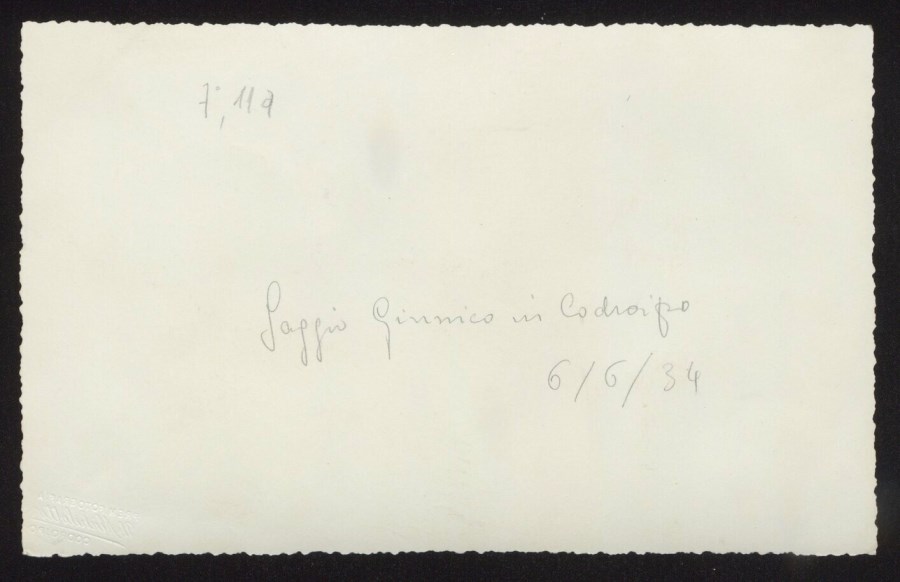 Due riprese fotografiche, stampate sullo stesso supporto, di due momenti in sequenza di un saggio ginnico svoltosi a Codroipo il 6 giugno 1934. La foto è parte di un gruppo di complessive tre fotografie.