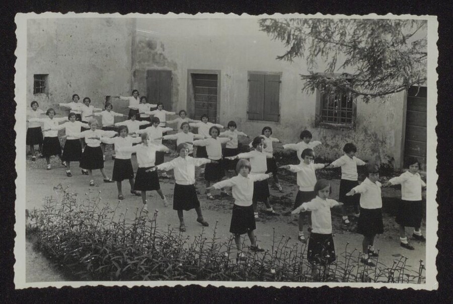 Gruppo di bambine in divisa da Piccole Italiane mentre svolgono attività ginniche all'aperto. La didascalia sul verso della fotografia le colloca a Sedegliano e data lo scatto al 22giugno 1934. L'organizzazione delle Piccole italiane era una organizzazione fascista alla quale erano obbligatoriamente iscritte le ragazze italiane di età compresa tra gli 8 e i 14 anni.