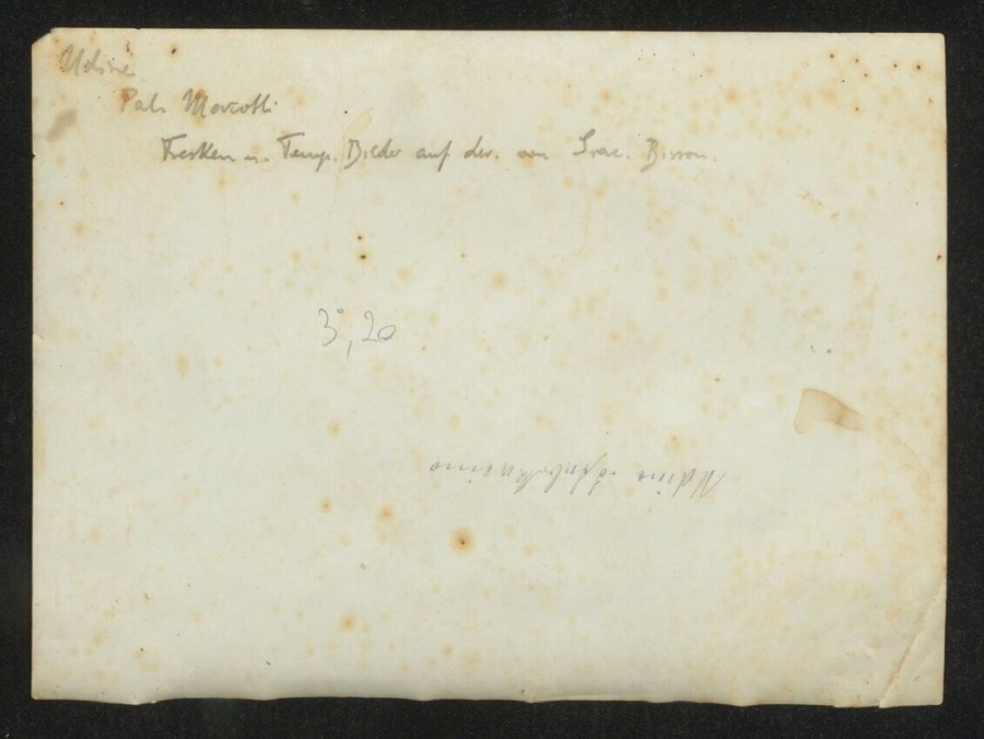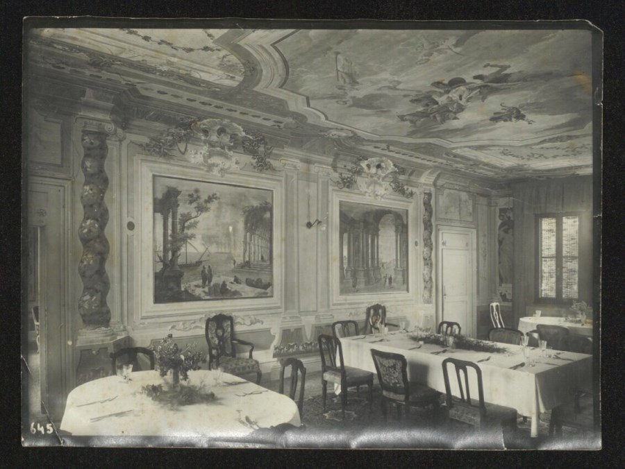 Veduta interna della sala da pranzo con tavoli imbanditi di Palazzo Marcotti a Udine. Il cav. Giulio Marcotti, Capitano del Distretto di Udine, era proprietario del palazzo di Piazza Primo Maggio dal 1890. Sulle pareti gli affreschi di Giuseppe Bernardino Bison (1762-1844), andati distrutti nel 1962.