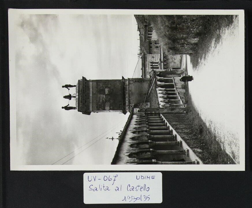 Udine: salita da piazza Contarena (piazza Libertà) al castello. A sinistra, il porticato ad elementi sfalsati, in stile tardogotico veneziano, voluto dal luogotenente Tommaso Lippomano (1486). In basso al centro, una donna che cammina verso il castello. Al centro, la Torre dell'Orologio (parte retrostante) di Giovanni da Udine (1527), che si innesta nella Loggia di San Giovanni. In cima alla Torre, i due Mori e, in mezzo a loro, una campana. In secondo piano, una parte della Loggia del Lionello, finita di costruire per volere di Nicolò Lionello.